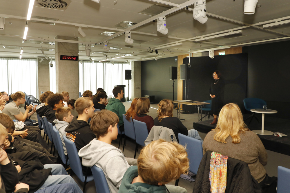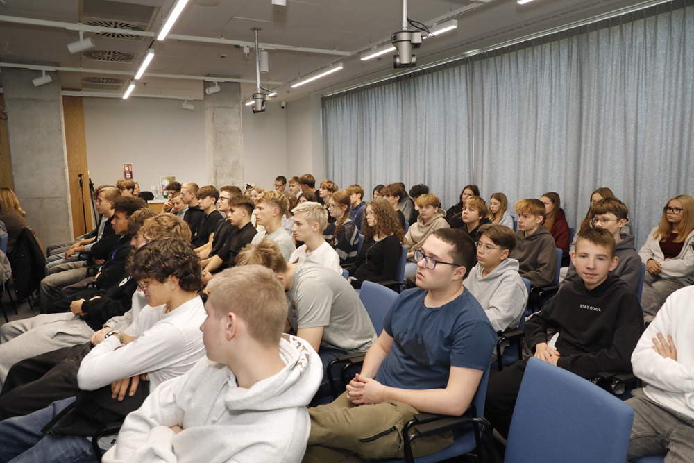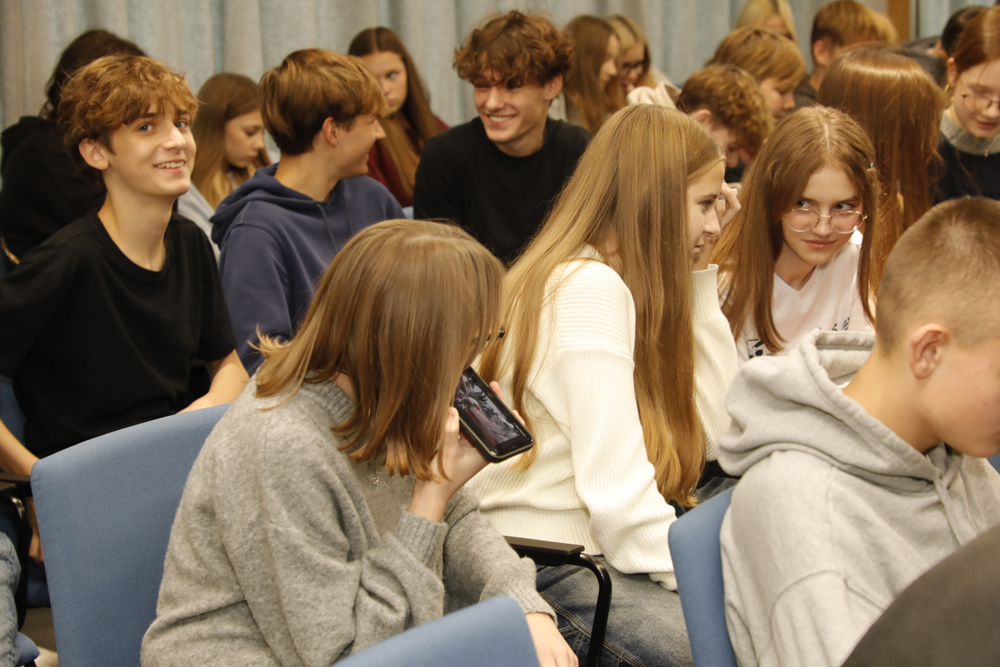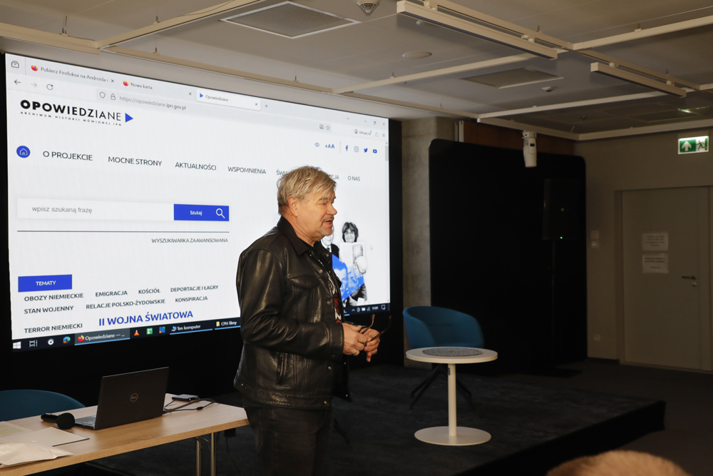Podczas spotkania z młodzieżą z XLVII Liceum Ogólnokształcącego im. Stanisława Wyspiańskiego oraz Szkoły Podstawowej nr 312 im. Ewy Szelburg-Zarembiny w Warszawie dr Tomasz Sikorski (Wydział Projektów Multimedialnych i Notacji BEN) zaprezentował projekt „Opowiedziane. Archiwum Historii Mówionej IPN” (https://opowiedziane.ipn.gov.pl/).