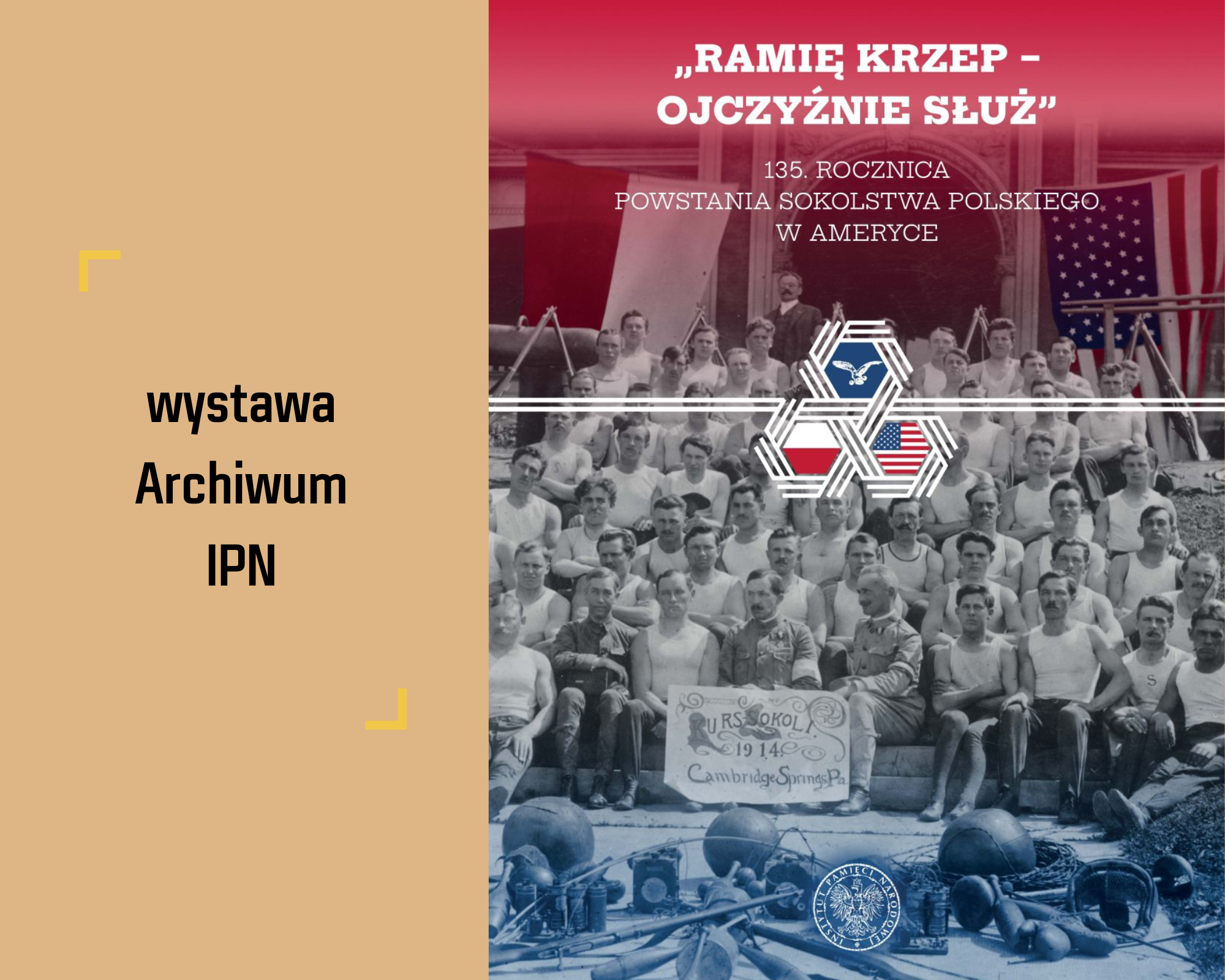 Poznają Państwo zasoby Archiwum IPN dzięki wystawie „Ramię krzep – Ojczyźnie służ”. Historia Sokolstwa Polskiego o w Ameryce. Na ekspozycji zobaczyć można unikatowe dokumenty i artefakty m.in.: list Heleny Paderewskiej, przewodniczącej Polskiego Białego Krzyża, do Agnieszki Wisły, bogaty zbiór fotografii – w tym fotografie panoramiczne, odznaczenia i odznaki związane z Sokolstwem, a także mundury, sztandary i artefakty sportowe (puchary, medale).